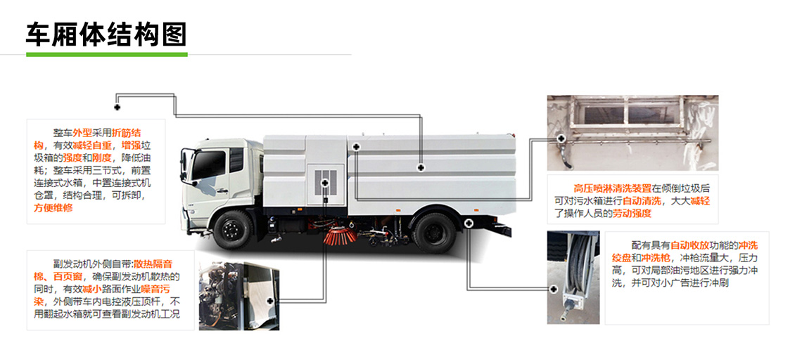 帶掃盤4把,江鈴副發動機;大力馬達;施耐德控件開關;臺灣電磁閥組;免維護自分離式離合器;免維護風機;不銹鋼水箱;不銹鋼垃圾箱;尾部LED箭頭燈;手動泵應急系統;刷臂轉動機構使用高新耐磨工程隔套,免打黃油;精密冷彎無縫液壓油管。