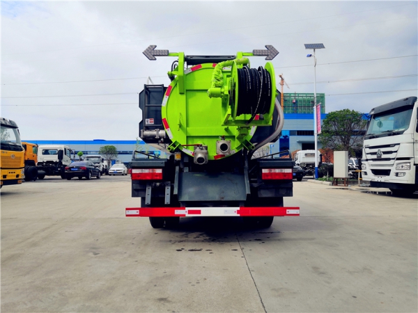 吸污部分:3.8方污罐,罐體5mmQ235優質碳鋼,配淄博SK-9水循環泵,8米吸污管一根,進氣管加過濾網,防溢閥加高,后蓋卡扣鎖緊,前視污亮管,后尾部加裝1個力拓牌100mm的球閥均帶出口,罐體帶舉升功能,后門帶液壓開啟。