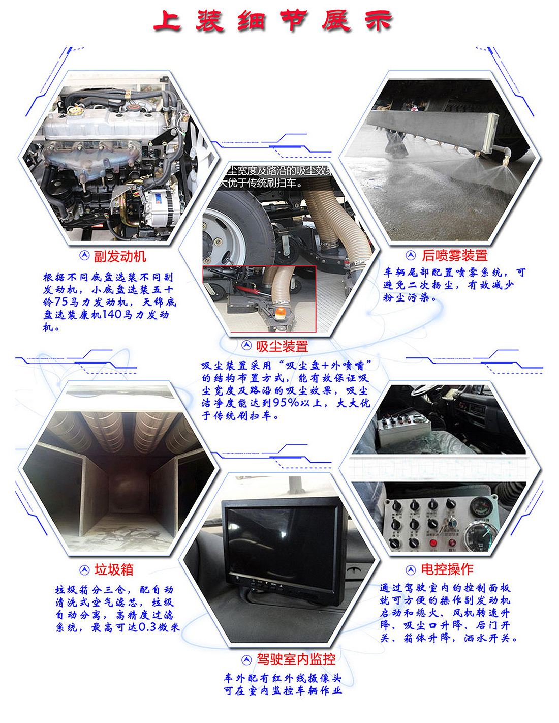 東風小多利卡5方吸塵車專用配置:塵箱:4立方米,水箱:1立方米;中置吸盤、江鈴五十鈴副發動機、施耐德控制開關、海普瑞斯電磁閥組、無級變速自動離合器、免維護離心式風機、高精度垃圾箱過濾系統(最高可達0.5微米),不銹鋼垃圾箱、進口脈沖閥、垃圾箱舉升自卸、尾部LED箭頭燈、車尾霧狀噴水潤濕功能、倒車影像、手動泵應急系統。