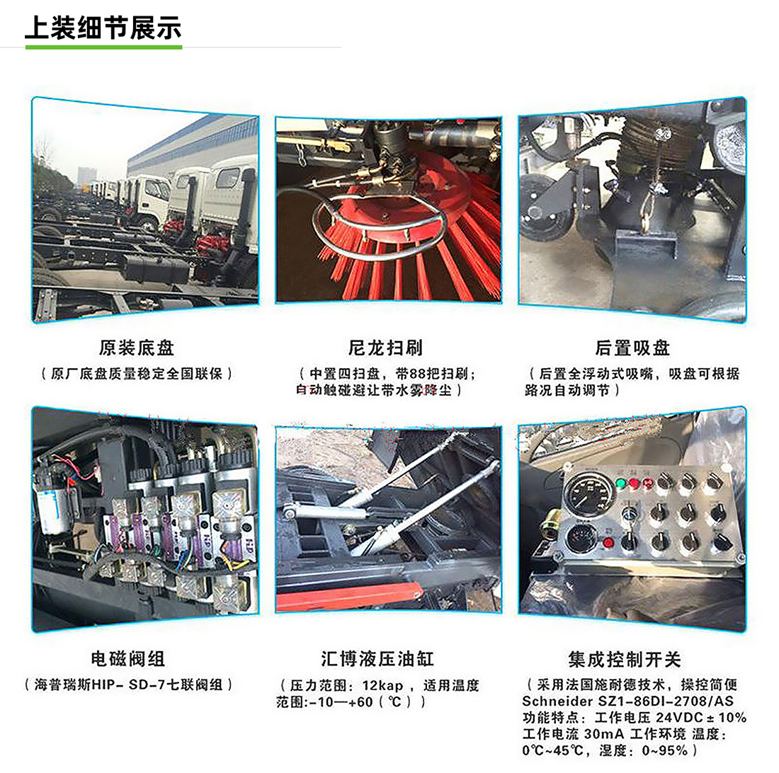 東風(fēng)多利卡7.5方吸塵車專用配置:塵箱:6立方米,水箱:2立方米;中置吸盤、江鈴五十鈴副發(fā)動機、施耐德控制開關(guān)、海普瑞斯電磁閥組、無級變速自動離合器、免維護離心式風(fēng)機、高精度垃圾箱過濾系統(tǒng)(最高可達0.5微米),不銹鋼垃圾箱、進口脈沖閥、垃圾箱舉升自卸、尾部LED箭頭燈、車尾霧狀噴水潤濕功能、倒車影像、手動泵應(yīng)急系統(tǒng)。