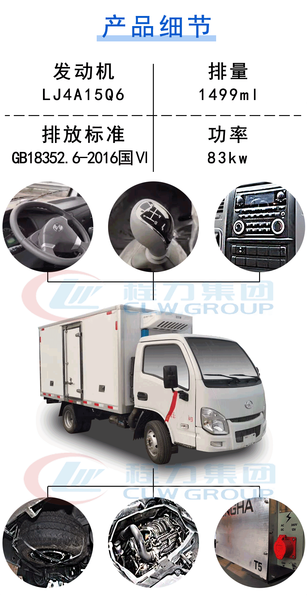 | 其他 | 1.ABS控制器型號/生產廠家:YF8/武漢元豐汽車電控系統有限公司;2.LJ4A15Q6凈功率為79kw,對應油耗值為9.6L/100km;3.車廂頂部封閉不可開啟;4.車廂可選裝不開門或側開門,可選裝左或右側開門,不同外觀側門和后門;5.可選裝導流罩;6.選裝其他廠家功率相當的制冷機組,KV300英格索蘭(中國)投資有限公司,K125勁達技術(河源)有限公司,MK358勁達技術(河源)有限公司;7.冷藏車類別:F類;8.隨底盤選裝駕駛室前圍面板,前圍格柵,后視鏡,前部燈具,前保險杠外觀,擴展輪輞外觀,擴展輪眉,隨底盤選裝排半駕駛室;9.駕駛室左側車門選裝裝飾標貼. | ||