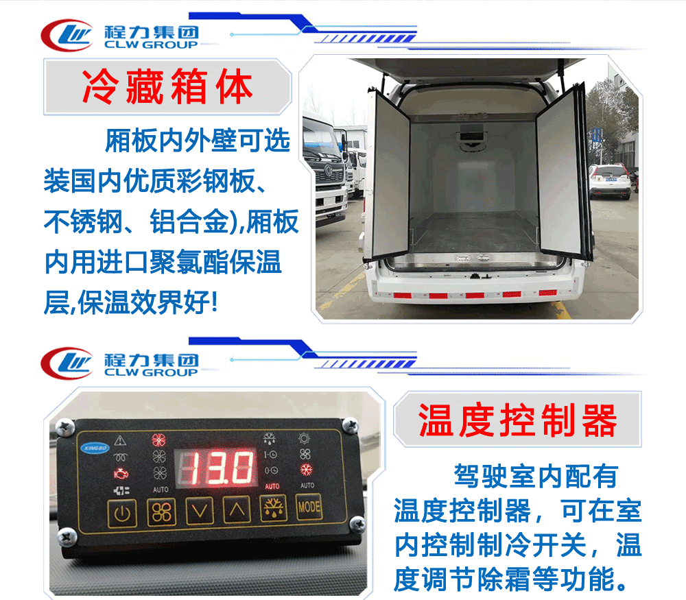國六東風多利卡冷藏車整車尺寸:5995*2040*3000箱體尺寸:4100*1840*1820功率/馬力:95KW 130馬力3.7L排量東風朝柴發動機(CY4BK461)7.00R16輪胎軸距:3308加裝零下15度制冷機空調、動轉、斷氣剎、ABS、中控鎖+電動車窗+遙控、剎車自調臂、可調大燈、日間行車燈,多功能方向盤上裝配置:箱體為內外玻璃鋼板,中間保溫材料為8cm聚氨酯保溫板,鋁花紋底板,箱體鋁合金型材包邊,包角,配雙開后門,單開側門,不銹鋼門框、鎖件、鉸鏈,其余