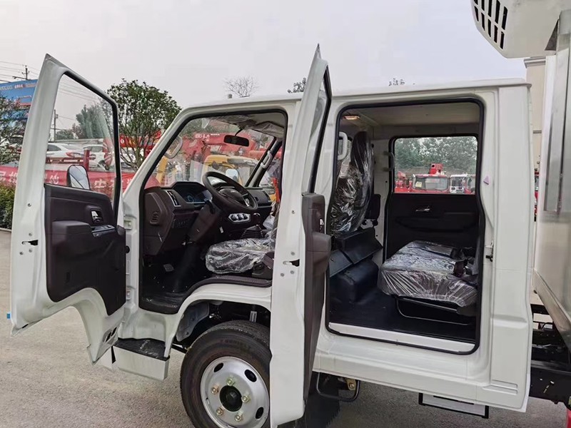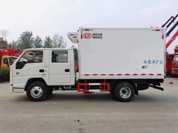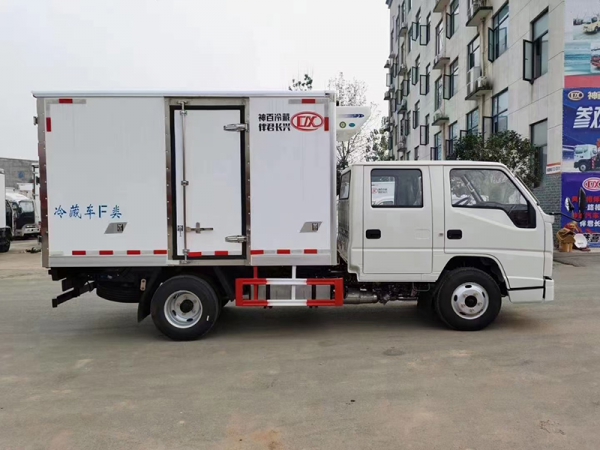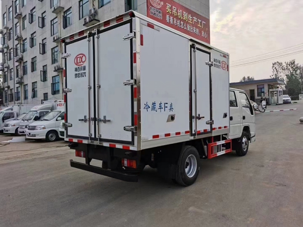 江鈴順達雙排冷藏車,整車型號:AAA5043XLCJX6,整車尺寸:5995×1980×2900,廂體尺寸:3250×1800×1800,五十鈴115馬力發(fā)動機,5檔變速箱,原廠空調(diào),助力,ABS,油剎,軸距3360,7.00R16LT 8PR輪胎,廂體采用內(nèi)外玻璃鋼、中間8CM 厚聚氨酯保溫板、底板為防滑花紋鋁板,單開側(cè)門,不銹鋼門鎖件,-15度制冷機組,其余標配。